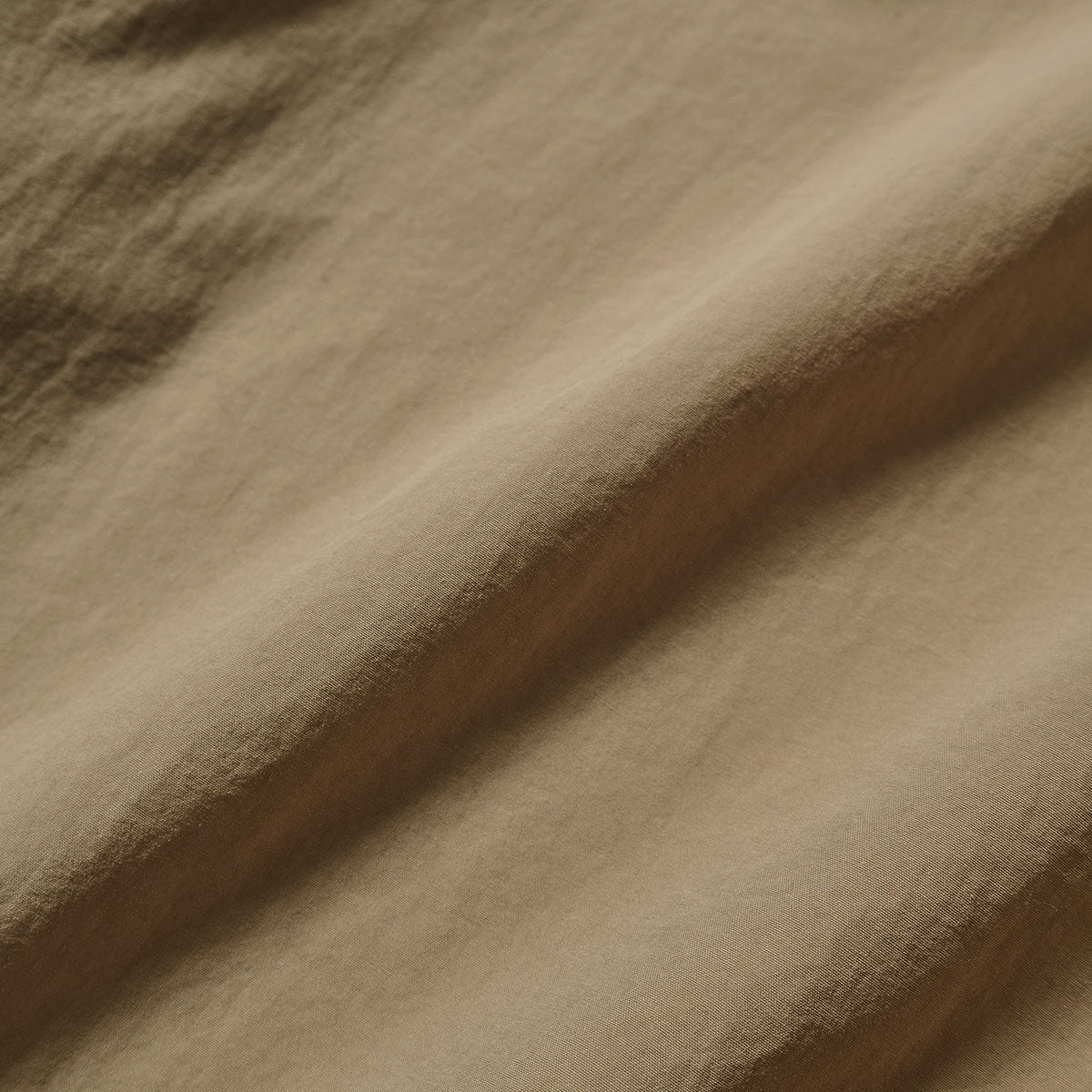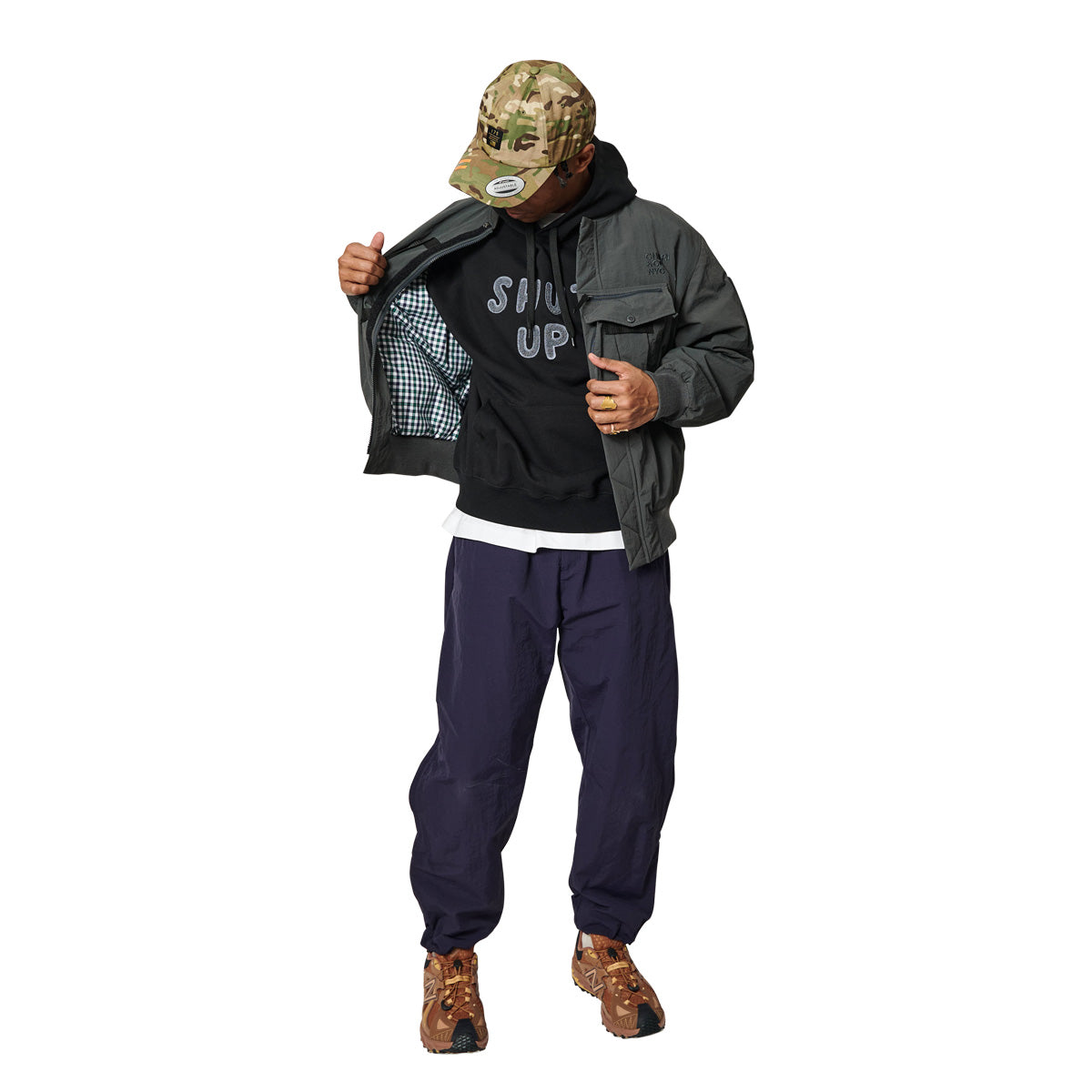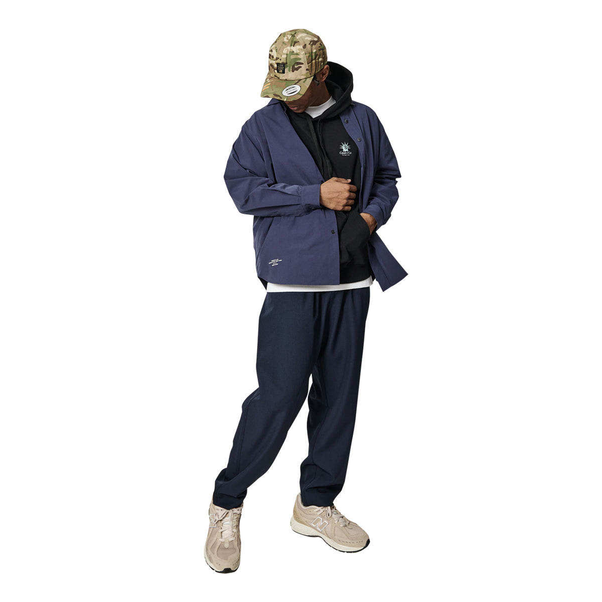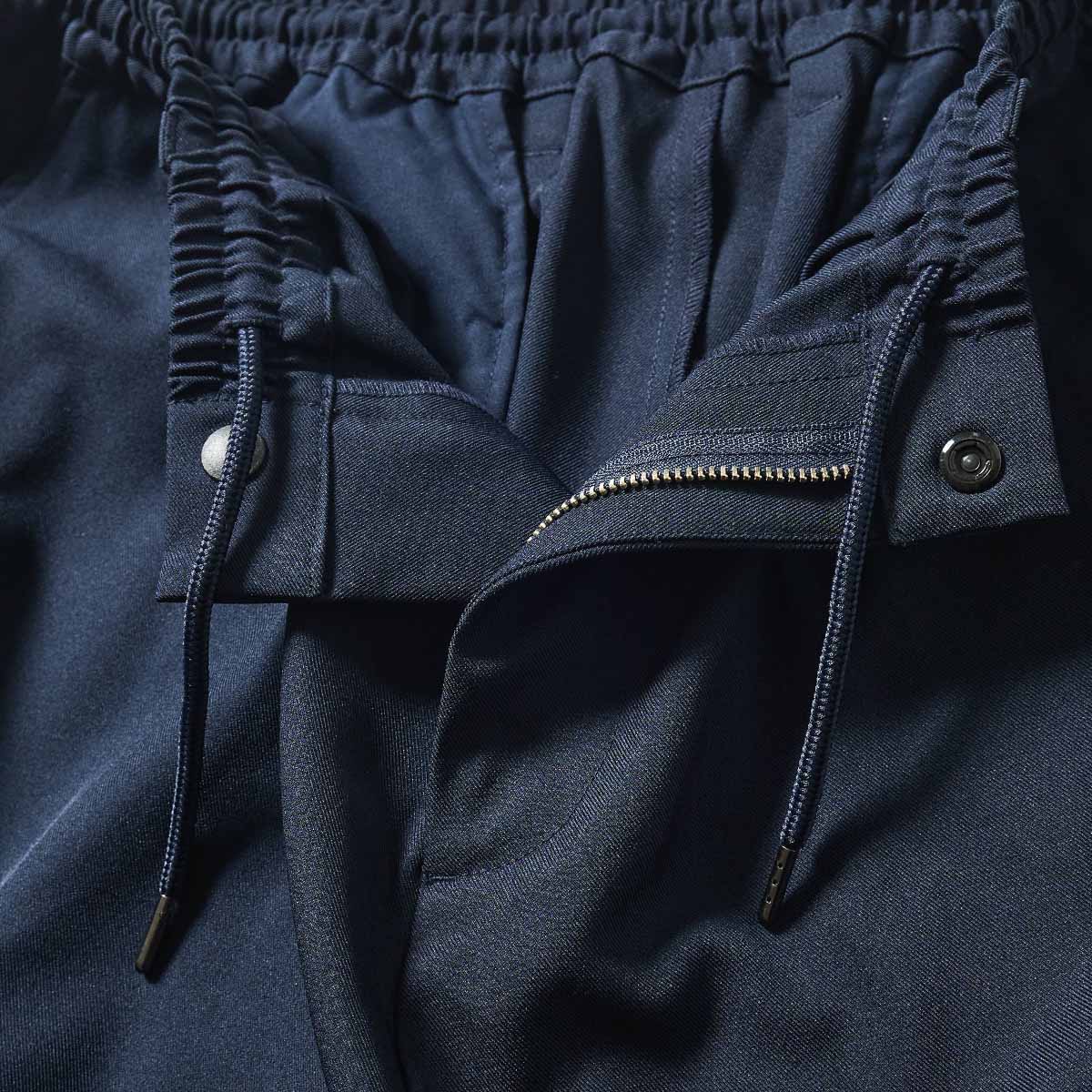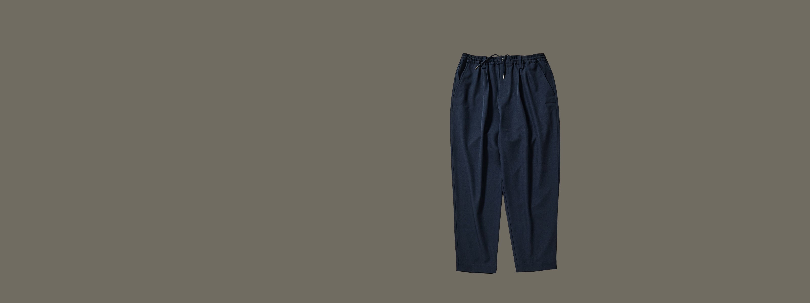 腰回りにシャーリング+ドローコードがあるため着こなしのバランス調整がしやすく様々な体型にフィットする万能パンツ。