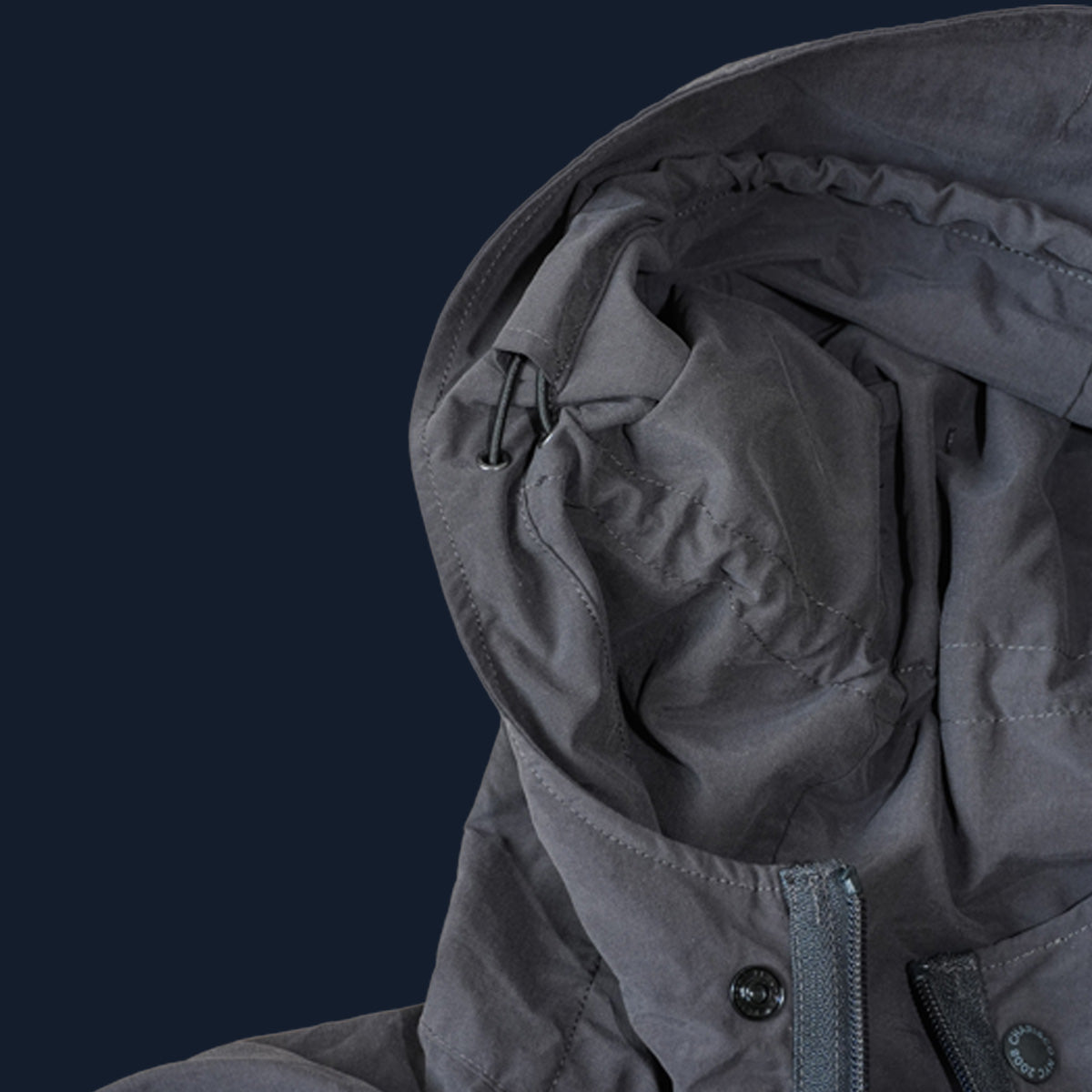フロント上部の3つのドットボタンによりファスナー全開でも風のバタつきを抑え、着こなしにも変化を加えることができる。
