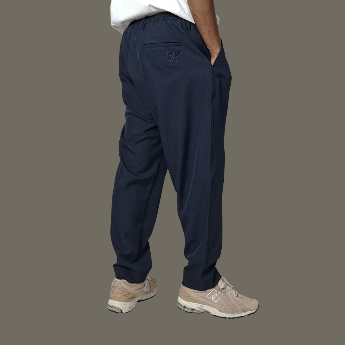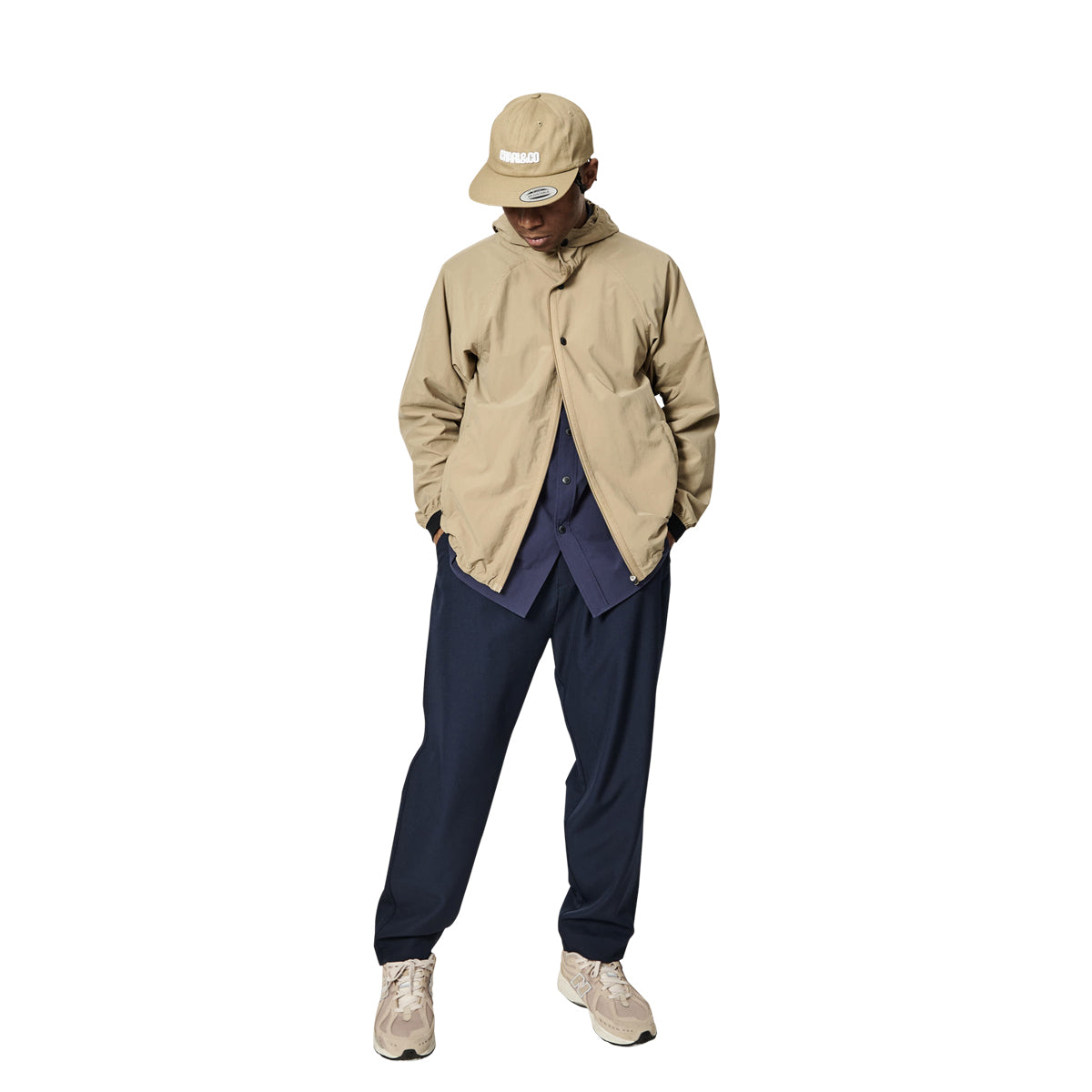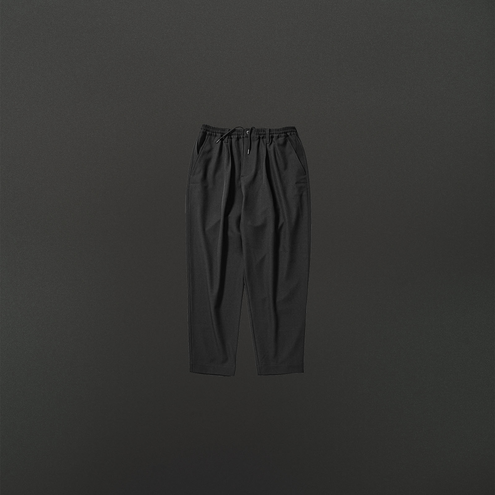 腰回りにシャーリング+ドローコードがあるため着こなしのバランス調整がしやすく様々な体型にフィットする万能パンツ。