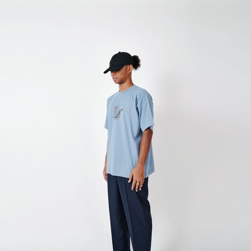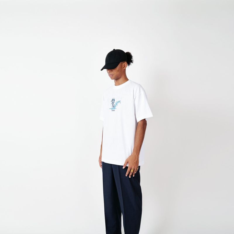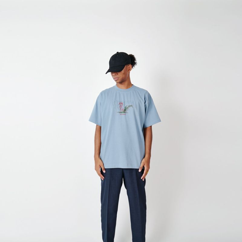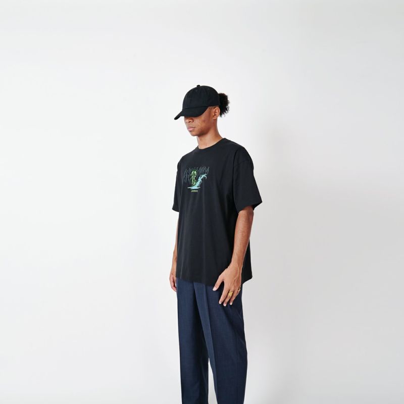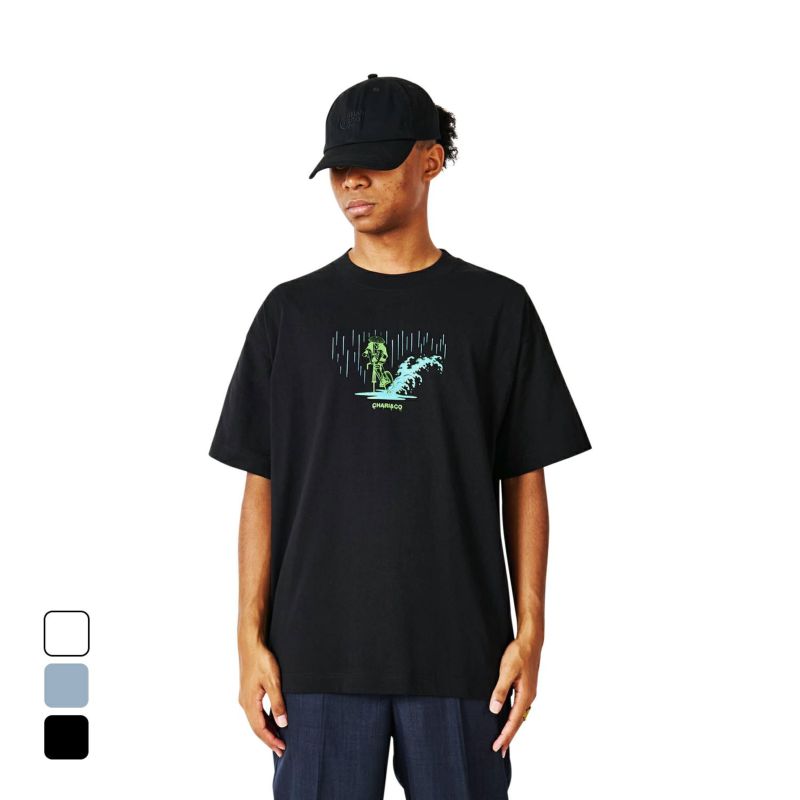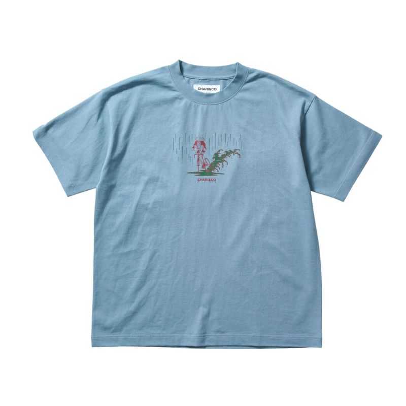 ストリートカルチャーと浮世絵をMIXさせるアーティストNAGA。以前CHARI&COのために描き下ろした雨の中のスキッドする江戸商人がSNSで世界的にバズったことで再度このグラフィックを採用。今回はフロントに水溜りの水をぶっかける。身幅をしっかり確保し着丈を少し短くすることで16年前のブランドスタート時からあったストリート感ある野暮ったさを一新し、現在のモダンさを優先。長期的な着用を想定して開発したオリジナルカスタムボディ。16/-のオープンエンド糸を使用しているため、ドライでガシッとした着心地の良い、アメリカンコットンライクに仕上がっている。