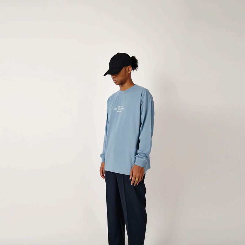 ニューヨークのレジェンドグラフィックアーティストSTASHが残した言葉、“時間だけは戻ることができない”。過去に戻ってやり直したいことがいくつあることか。身幅をしっかり確保し着丈を少し短くすることで16年前のブランドスタート時からあったストリート感ある野暮ったさを一新し、現在のモダンさを優先。長期的な着用を想定して開発したオリジナルカスタムボディ。16/-のオープンエンド糸を使用しているため、ドライでガシッとした着心地の良い、アメリカンコットンライクに仕上がっている。