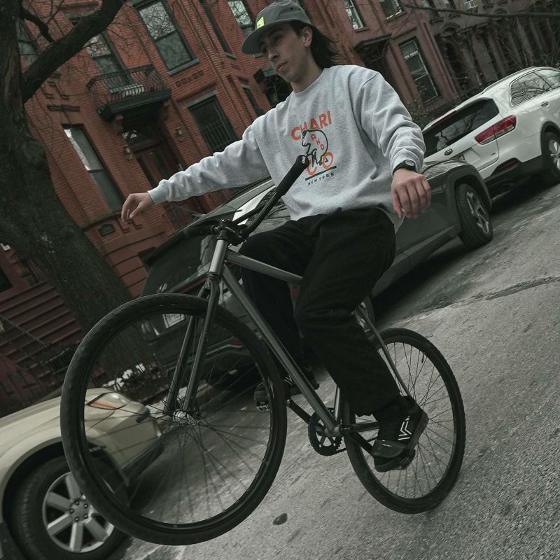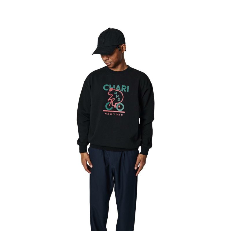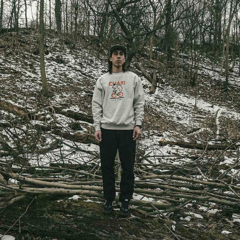 名は出せないものの世界的に有名なブランドのグラフィックを手がけるデザイナーに依頼したイラスト。絶妙な線の太さで可愛さと高級感を同時にかき立てるハイエンドライク手法。シルエットはコンテンポラリーな型で裏毛は通年で使える10.6oz。起毛させる一歩手前の“半掻き"に設定することでアツくなりすぎない絶妙な生地の硬さと肉厚を表現した。