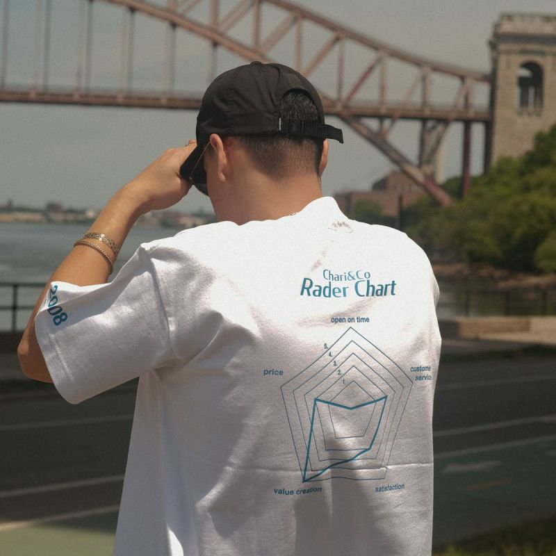 CHARI&CO NYC STORE のお店が時間通りに空いていないとのクレームが多かった。ただその一方でそこでしか体験でできないコトが多く東海岸西海岸問わず多くのカスタマーが訪れた。背中側裾にはニューヨークの自転車屋から始まったブランドスピリッツを感じることができるリフレクターテープがファンの安全を守る。長期的な着用を想定して開発したオリジナルカスタムボディ。16/-のオープンエンド糸を使用しているためドライでガシッとした着心地の良い、アメリカンコットンライクに仕上がっている。首元のフライスには5%ポリウレタンを入れることで程よいテンションを実現し首通しを最適化した。