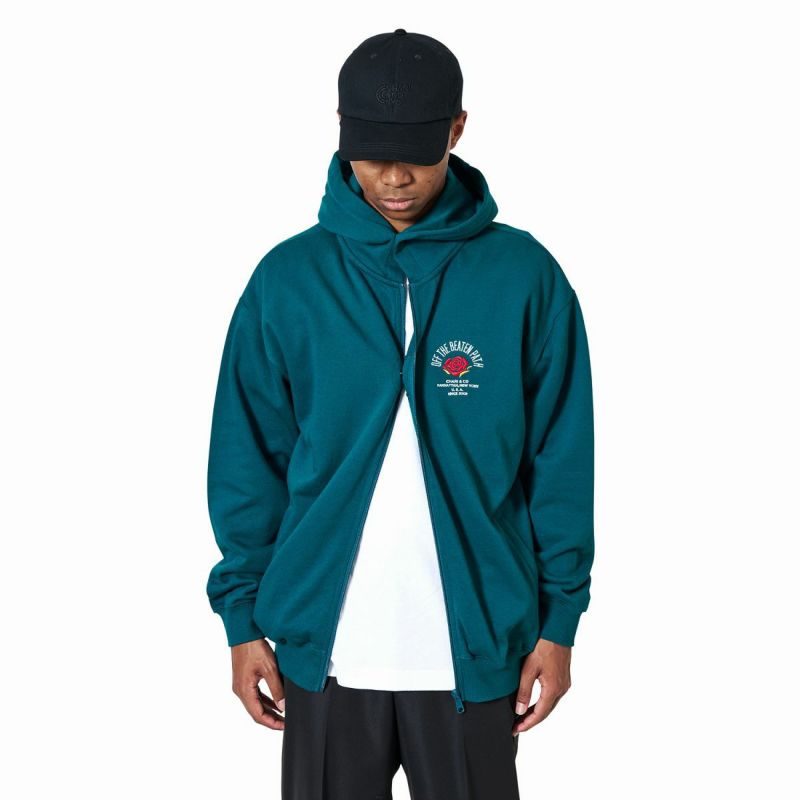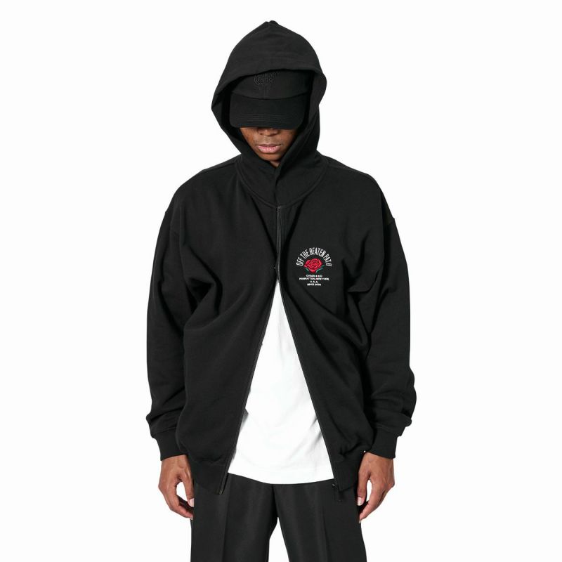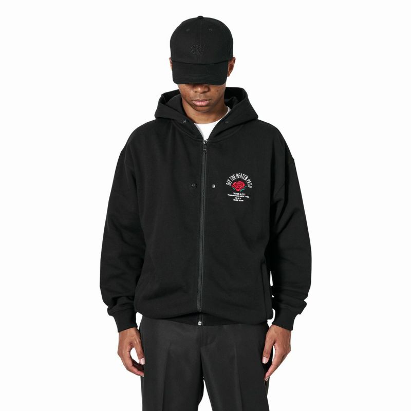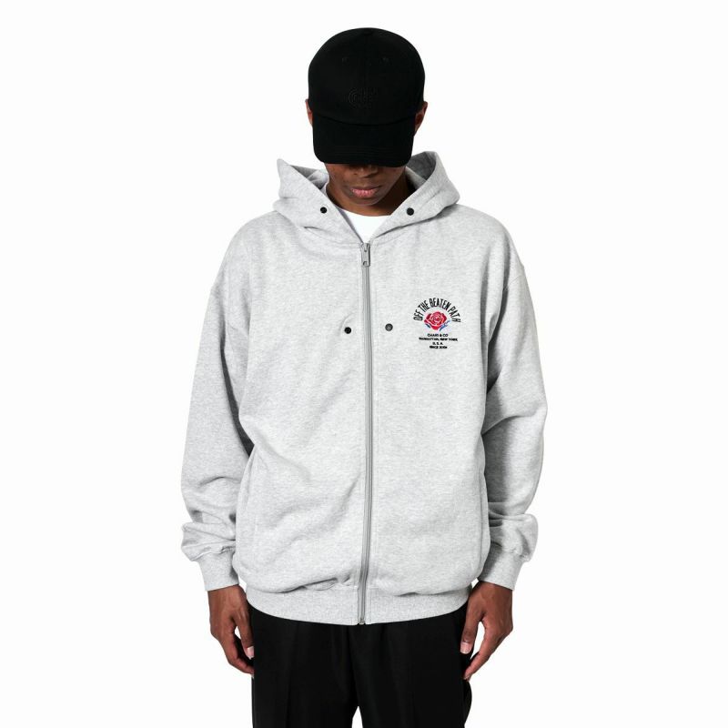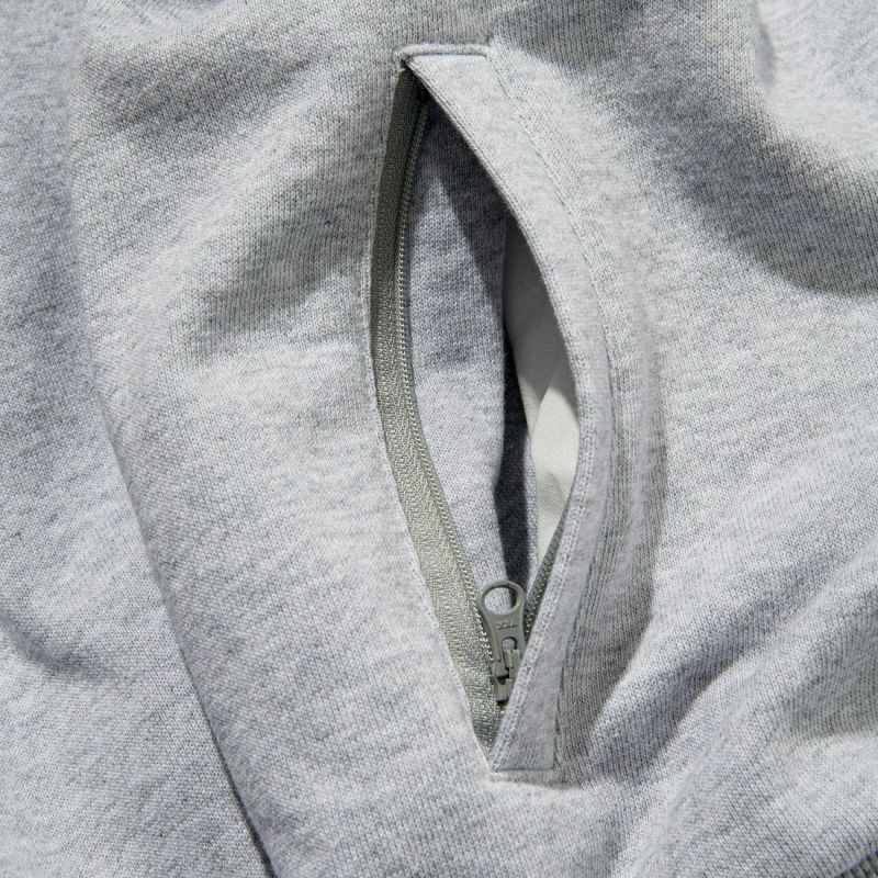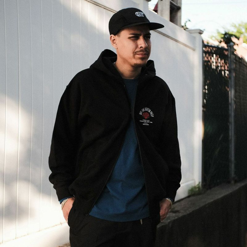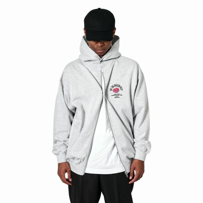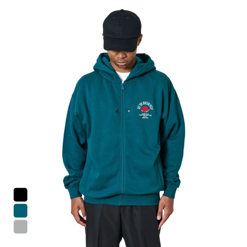 『人の歩んだ道を行くな。』CHARI&CO のスローガンでもあるこの言葉と一輪の刺々しいバラ。“尖って、思う道を行け”、それでいいんだよと言わんばかり。胸元に付くトレックボタンが前開きの状態でもバタつきを抑え、着こなしの幅を広げる。コンテンポラリーなシルエットで裏毛は通年で使える10.6oz。起毛させる一歩手前の“半掻き"に設定することで絶妙な生地の硬さと肉厚を表現した。NY STORE開業以来継続している安全を考慮したブランドスピリッツであるリフレクターテープが後ろの裾に縫われている。
