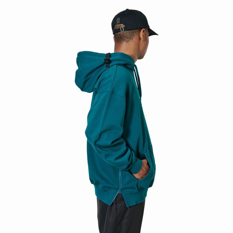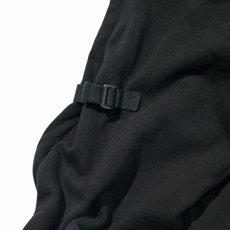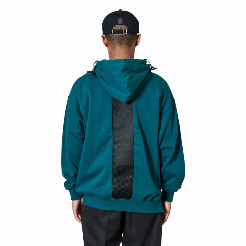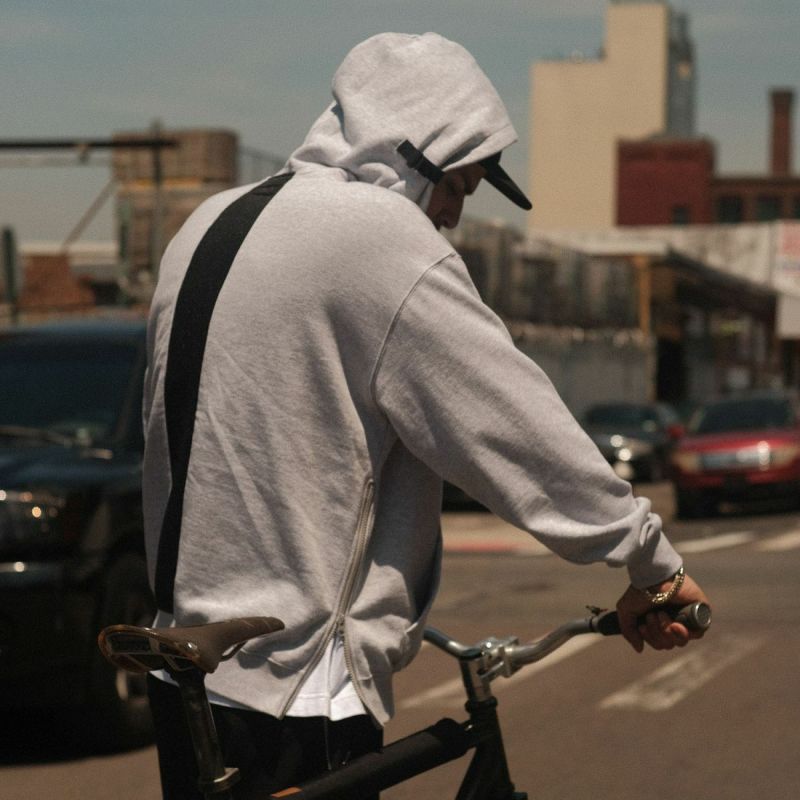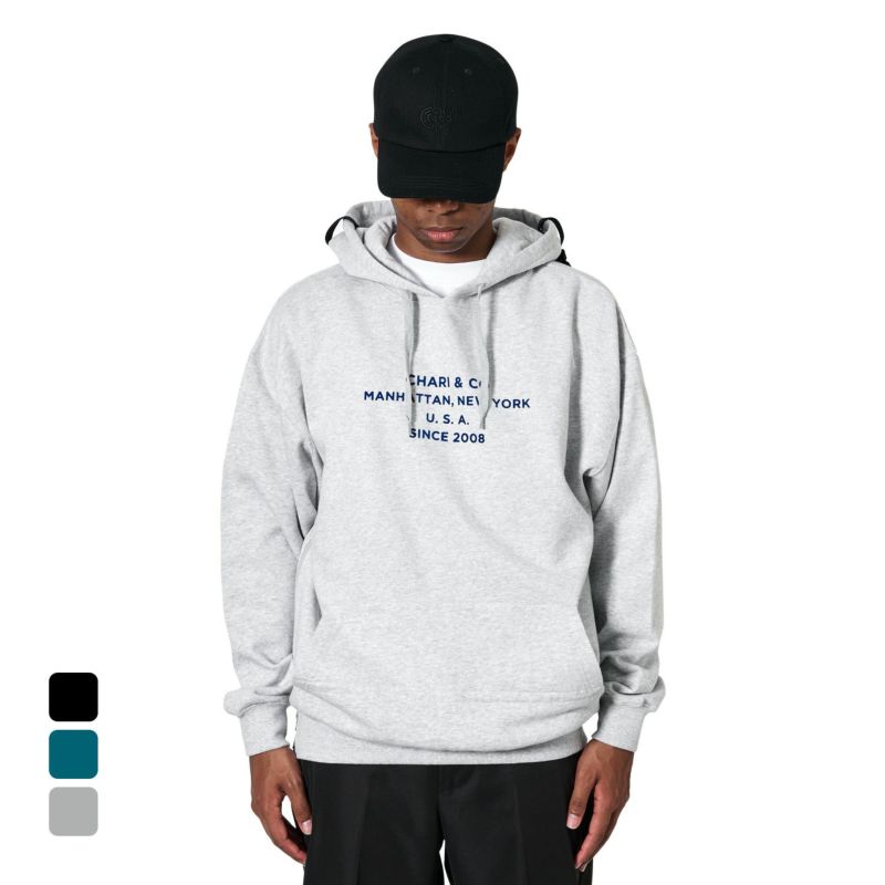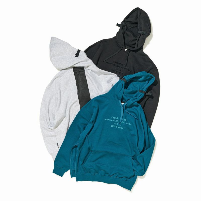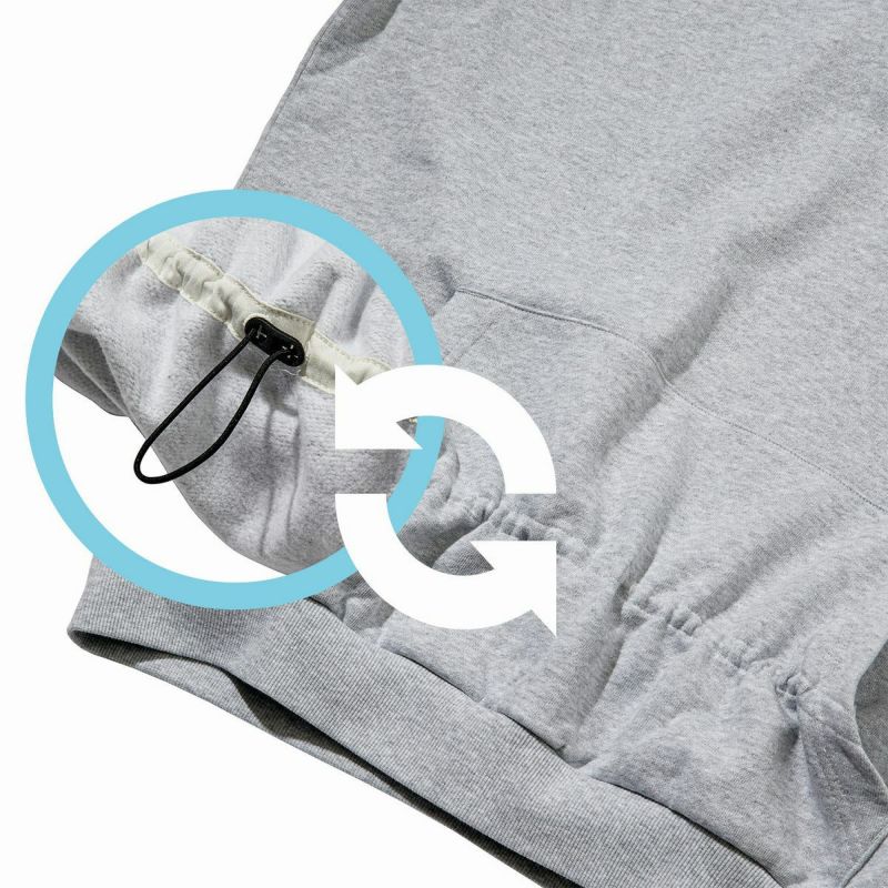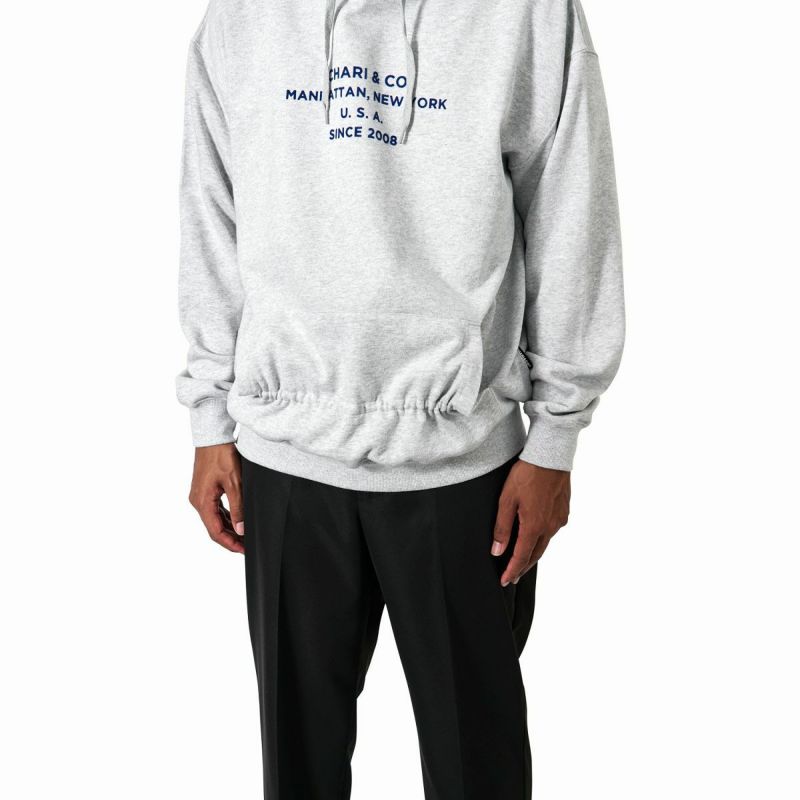 以前シーズンから使われているロケーションロゴを裏毛にフロッキープリントするオルタナティブな装い。フード横のストラップはフードを被った自転車走行時等にも片手で引くことができ、背後の確認をするための視界を確保する。サイドシームのファスナーは脱着のストレスを軽減させてくれる。背中のラッセルベンチレーションは移動など身体を動かすとあつくなるのを防ぎ一度着るとそのありがたさを噛み締めることになる。カンガルーポケット内側がスピンドルにより絞れるナローダウンシステムは物の落下を防いだり風によるバタ付きを抑えたり、更にはコーディネートの幅を広げることも出来る。コンテンポラリーなシルエットで裏毛は通年で使える10.6oz。起毛させる一歩手前の“半掻き"に設定することで絶妙な生地の硬さと肉厚を表現した。