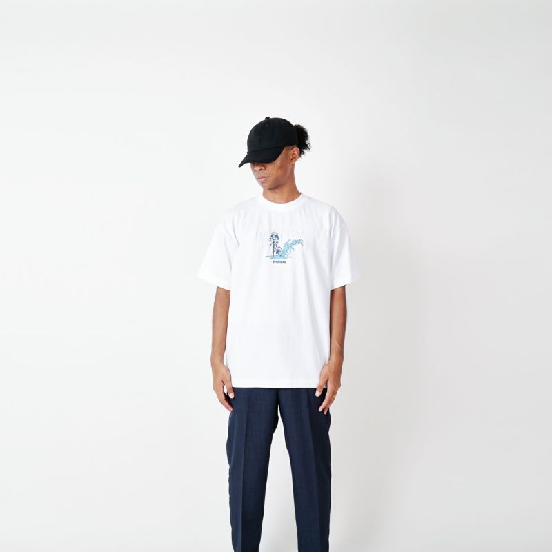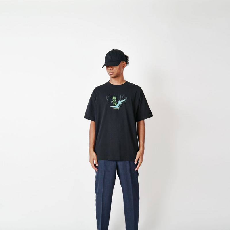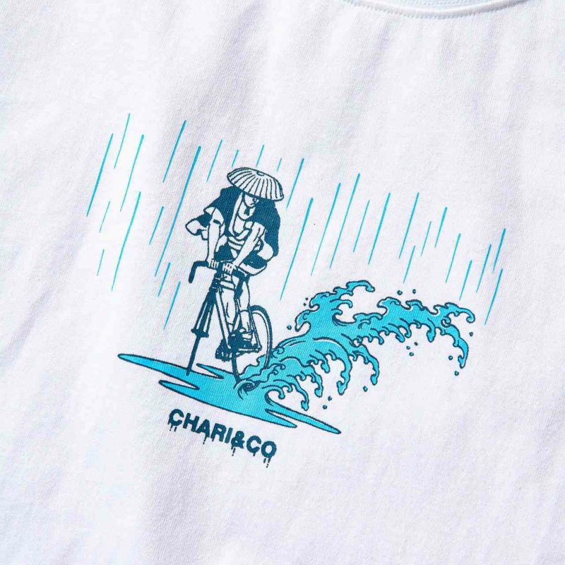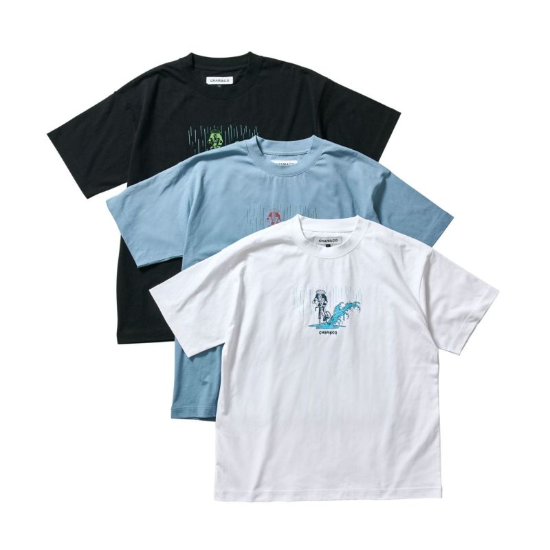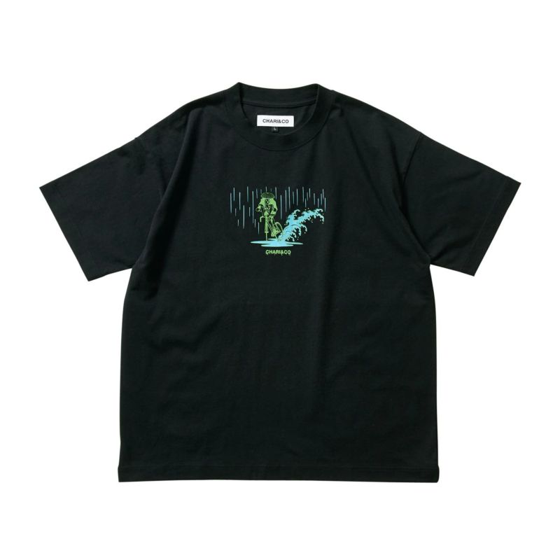 ストリートカルチャーと浮世絵をMIXさせるアーティストNAGA。以前CHARI&COのために描き下ろした雨の中のスキッドする江戸商人がSNSで世界的にバズったことで再度このグラフィックを採用。今回はフロントに水溜りの水をぶっかける。身幅をしっかり確保し着丈を少し短くすることで16年前のブランドスタート時からあったストリート感ある野暮ったさを一新し、現在のモダンさを優先。長期的な着用を想定して開発したオリジナルカスタムボディ。16/-のオープンエンド糸を使用しているため、ドライでガシッとした着心地の良い、アメリカンコットンライクに仕上がっている。