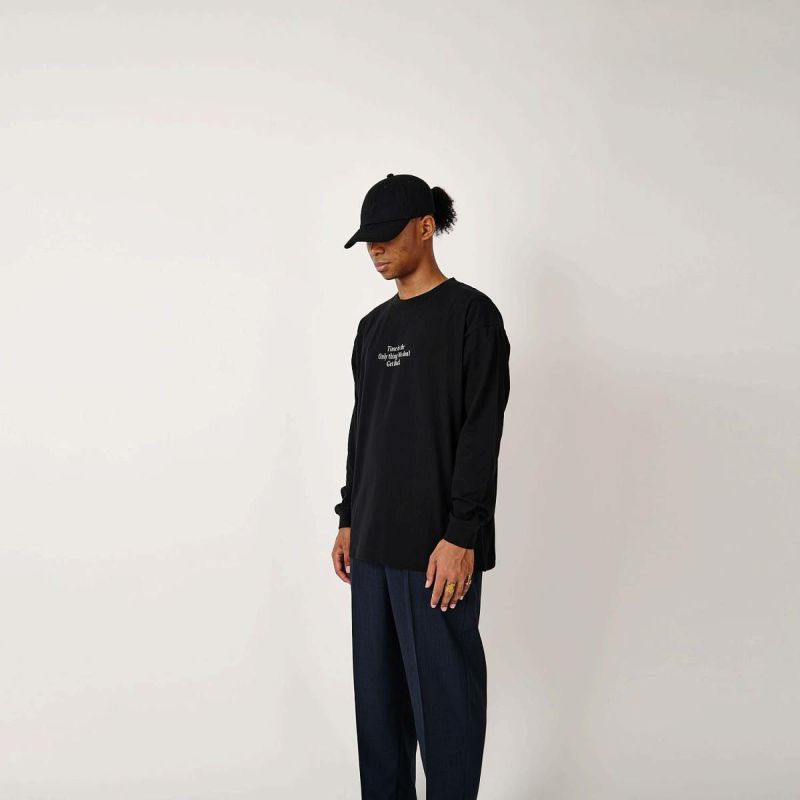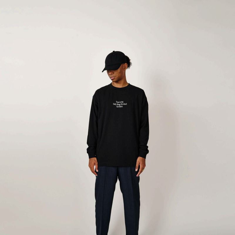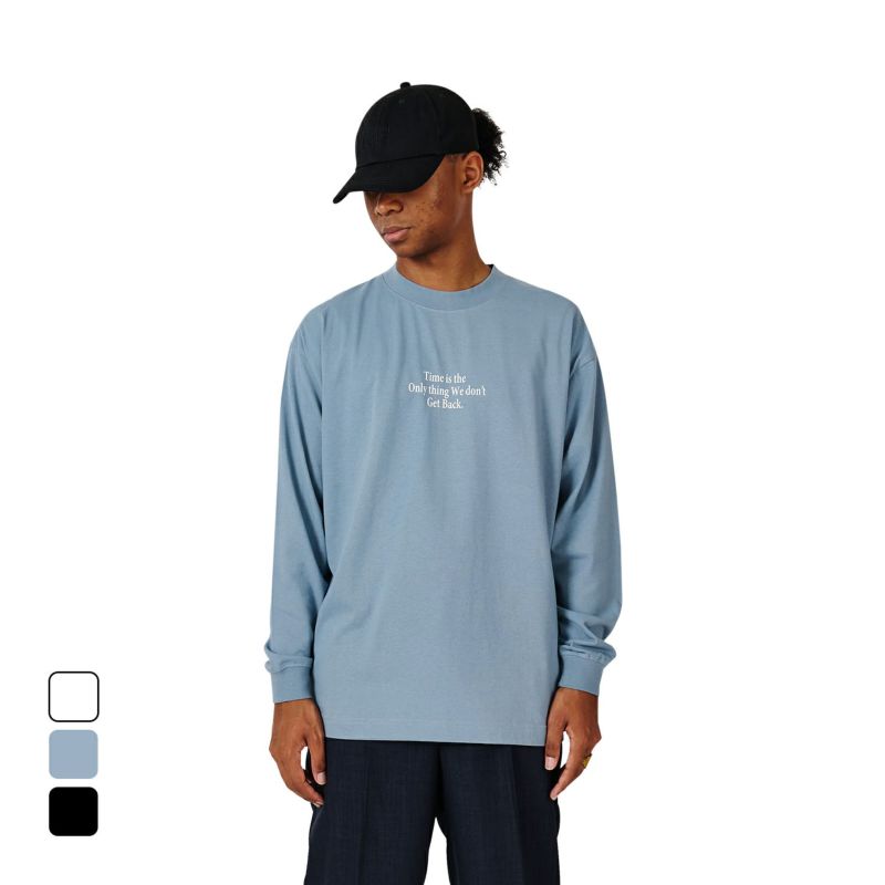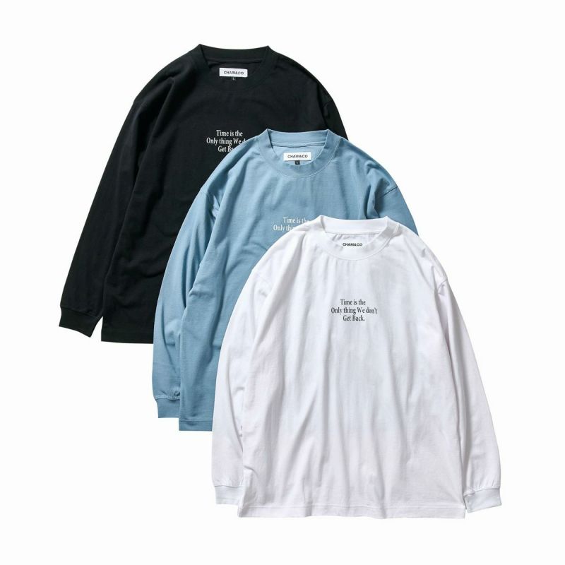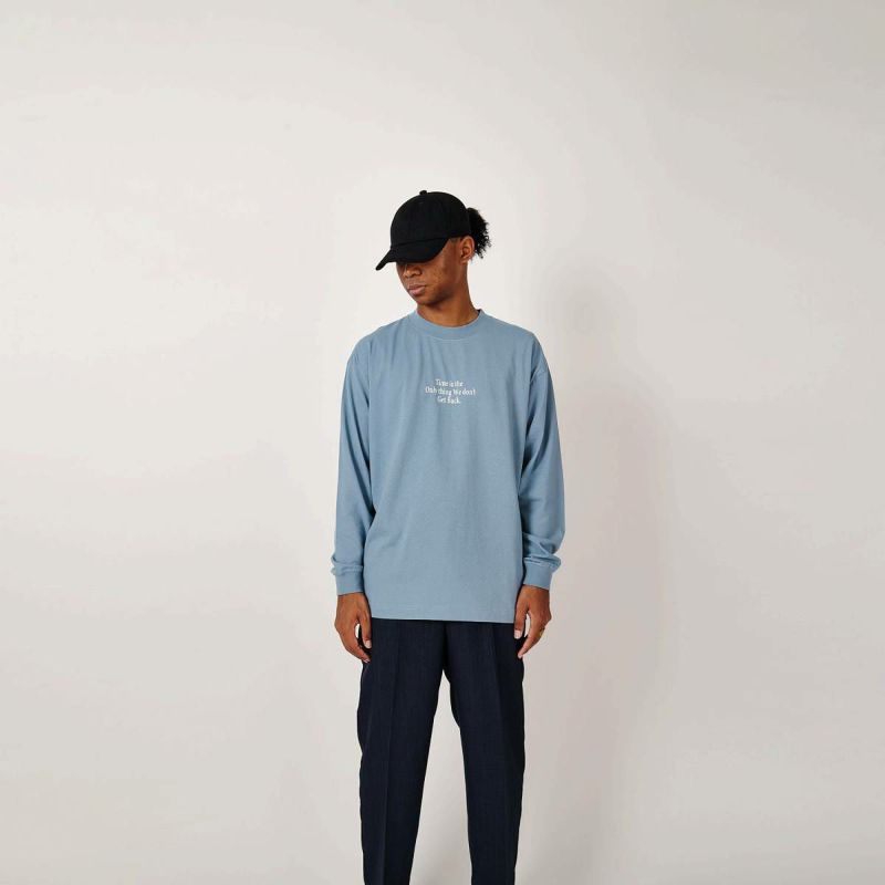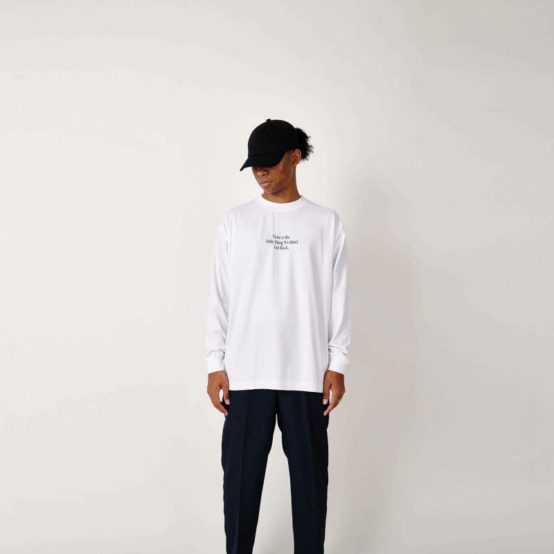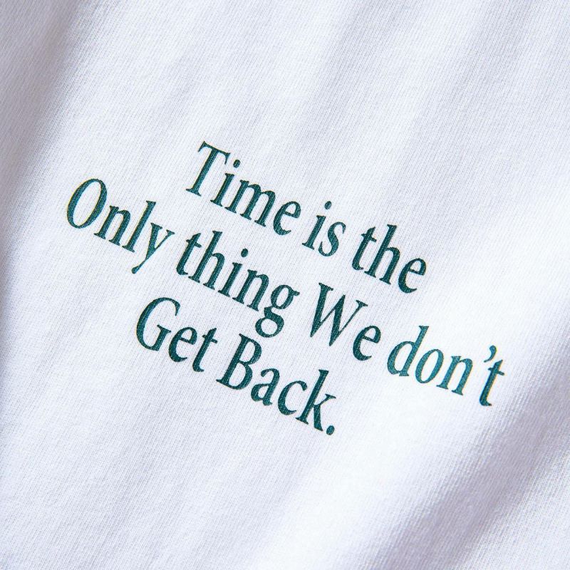 ニューヨークのレジェンドグラフィックアーティストSTASHが残した言葉、“時間だけは戻ることができない”。過去に戻ってやり直したいことがいくつあることか。身幅をしっかり確保し着丈を少し短くすることで16年前のブランドスタート時からあったストリート感ある野暮ったさを一新し、現在のモダンさを優先。長期的な着用を想定して開発したオリジナルカスタムボディ。16/-のオープンエンド糸を使用しているため、ドライでガシッとした着心地の良い、アメリカンコットンライクに仕上がっている。