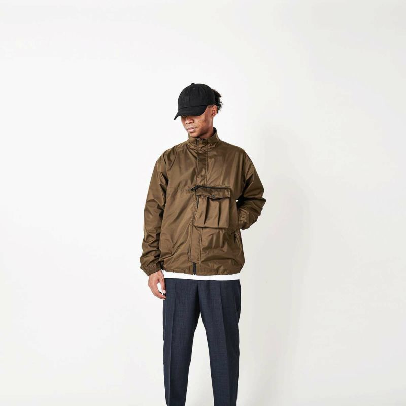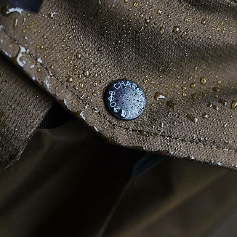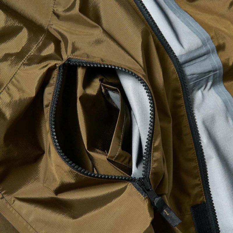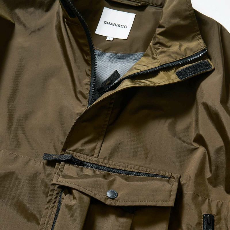 透湿防水生地のジャケットでも傘があったりヘルメットを被るからなどフードが必要でない場面も多い。フードがあることで首にかけているストラップが引っかかったりとマイナスなこともある。この高機能3レイヤージャケットではフードが無いことで得られるメリットを考え更に落下防止且つアクセス性を最大限に引き出したブランドオリジナルのユーティリティポケットを最適な位置に配置。またメインのサイドポケットは少し高めの位置にすることで物の重み、服の弛みを軽減させた。オリジナルドットボタンが高級感を突き上げブランド史上最高のジャケットとしてクオリファイドされている。