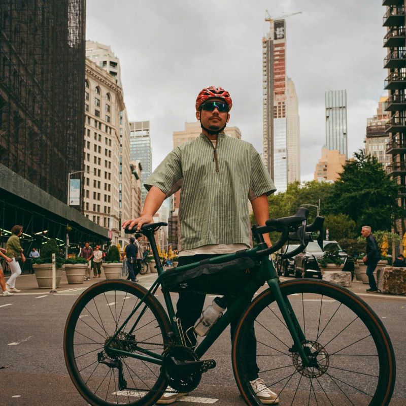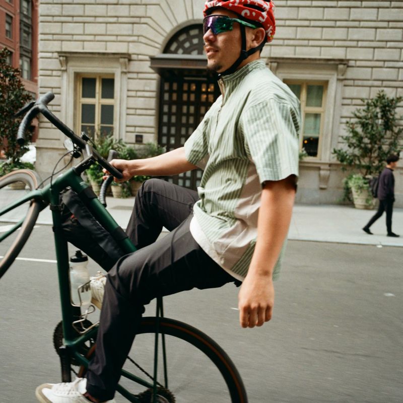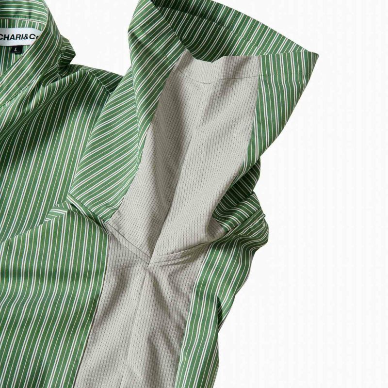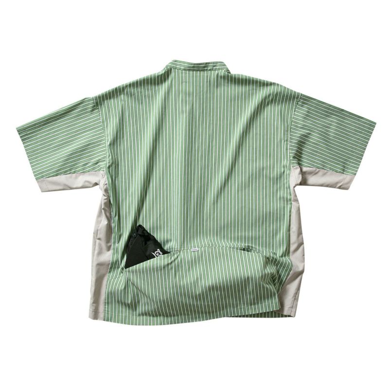 サイクリングジャージの様なシャツ。なのでこれはサイクリングジャージではなくシャツ。しかし脇下の通気性の高い生地の切り返しやフロントが大きく開閉できるファスナー。さらには背面の腰部分に装着された大きなポケットはほぼほぼサイクリングジャージと言ってもよい。大きなポケットには手袋やライトアウターなどを入れる想定だ。