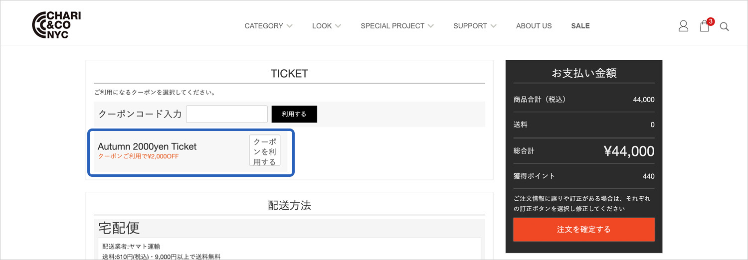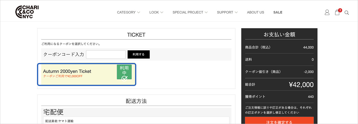 手順.2 クーポンが「利用中」となり 割引額が適用されますので、 そのままご注文を確定してください。